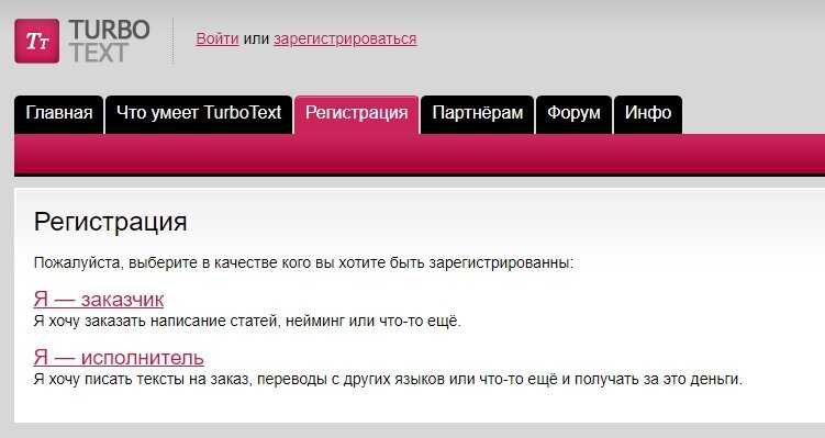 Заходим на биржу turbotext.ru (просто кликаем по ссылке), проходим простейшую регистрацию, для этого в верхней части экрана нажимаем «Регистрация», далее нажимаем «Я- исполнитель»: