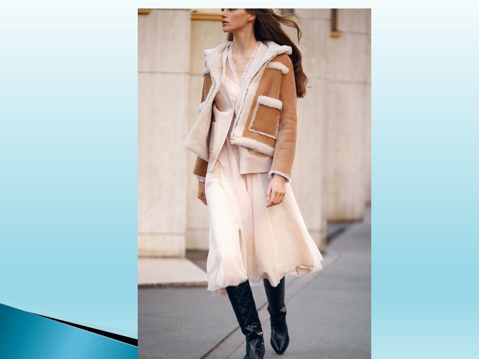 С чем же носить их в самом начале зимы? Рассмотрим разные варианты. Например очень стильно смотрятся такие дублёнки с лёгкими платьями и высокими сапогами.