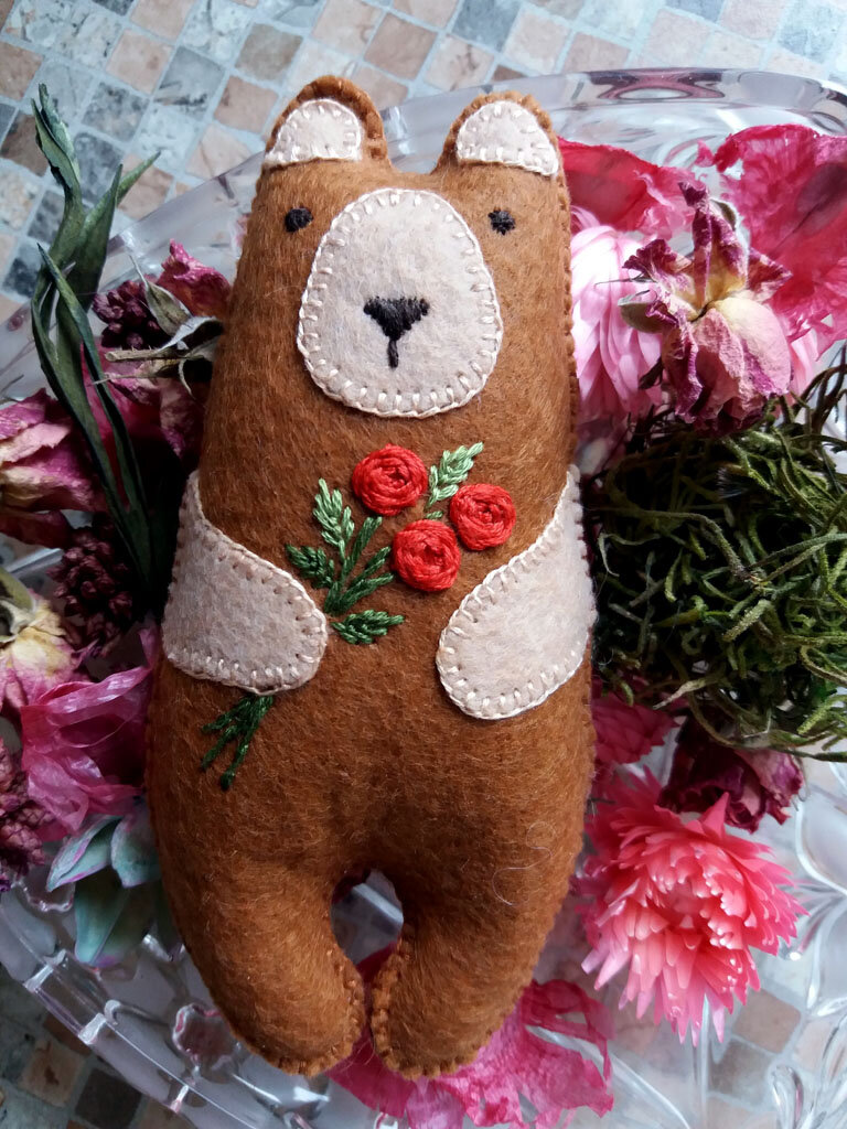 С детьми то все понятно, а взрослые то как играют? Делают эти игрушки, шьют им одежду, вышивают. Вот и я предлагаю вам поиграть в игрушки, сделать из фетра вот такого милого Мишку с букетом из роз!