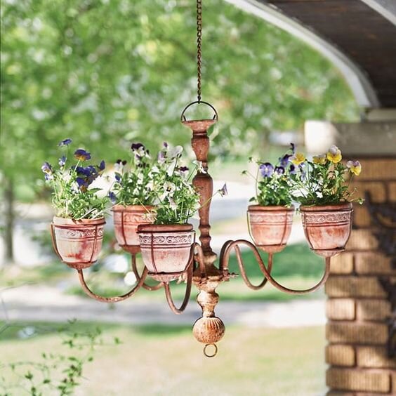 Старая люстра и глиняные горшки - прекрасное нескучное сочетание.