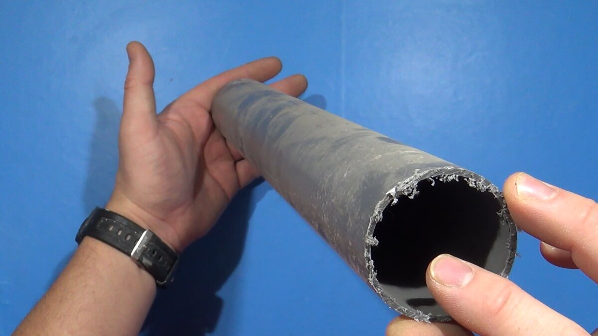 На глаза мне попалась канализационная труба, приблизительно с пол метра длинной. Я ее взял и отправился дальше. Следуя дальше уже в гаражах, я нашел две пяти литровые баклажки из под "омывайки". Их тоже прихватил. В самом начале моего пути из дома, когда я нашел трубу, мне вспомнилась одна самоделка, которую я хотел сделать давно. И тут, сегодня, все нужные детали нашлись мне по пути. Наверное это судьба и пора исполнить задуманное. По приходу в гараж, все найденное отчистил от пыли и приступил к изготовлению. В первую очередь нужно отрезать горлышки у баклажек возле основания. Ровняю края и обрабатываю напильником. Теперь займусь трубой. Пол метра это много, я отпилил не нужный мне отрезок. Какой размер нужен вам, определитесь сами, все делается на глаз. Все готово, осталось соединить все в единую констру