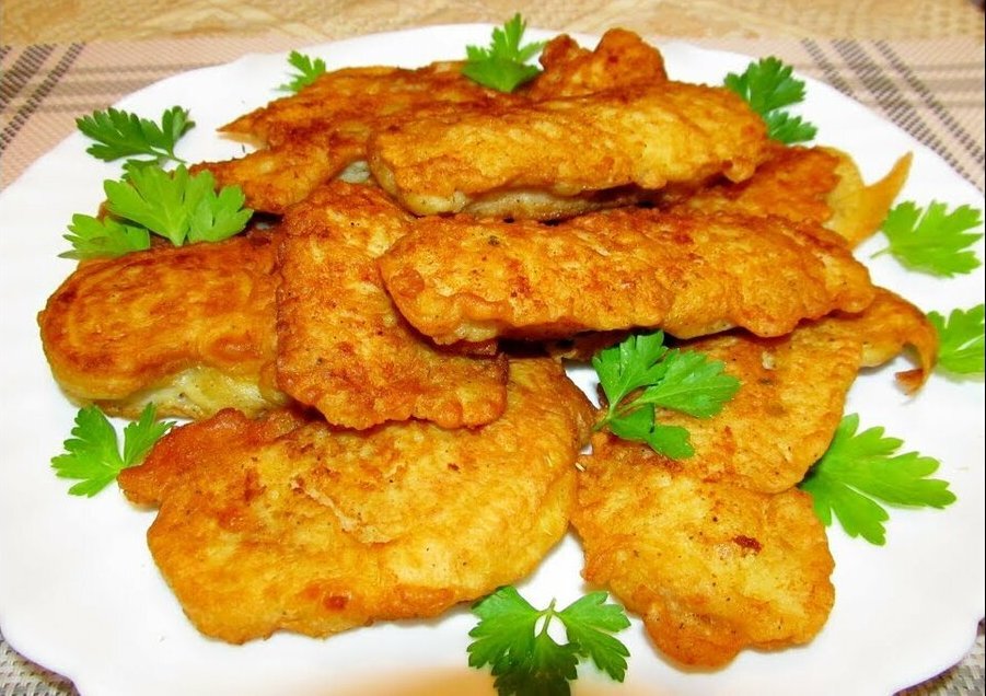 Обжариваем лук на растительном масле до прозрачности. Рыбу выкладываем на тарелку и сверху выкладываем обжаренный до прозрачности лук. Наша рыбка в кляре готова.