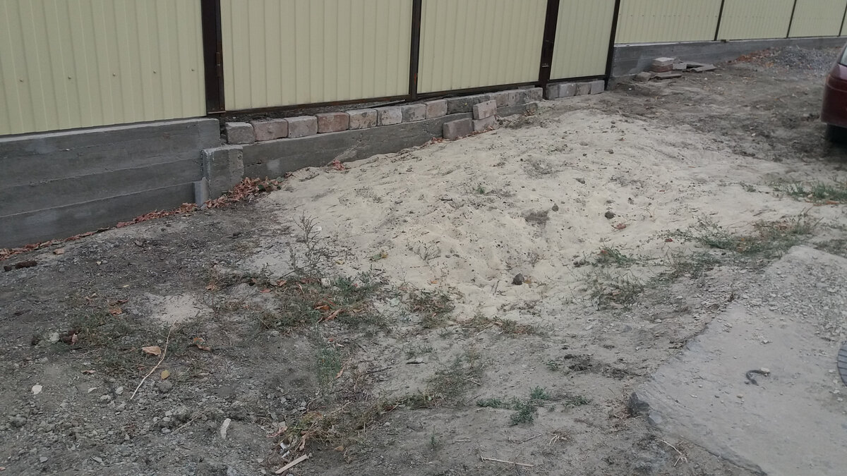Камни и кирпичи брал у соседей, они просто так лежат на улице. Затем засыпал все промежутки между камнями землей. Таким образом сделал 2 дела и себе площадку для авто и улицу почистил.