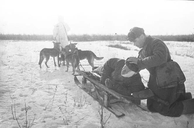 Из-за плотного огня мы, санитары, не могли пробраться к тяжело раненным однополчанам. Раненым нужна была срочная медицинская помощь, многие из них истекали кровью. Между жизнью и смертью оставались считанные минуты… На помощь приходили собаки. Они по-пластунски подползали к раненому и подставляли ему бок с медицинской
