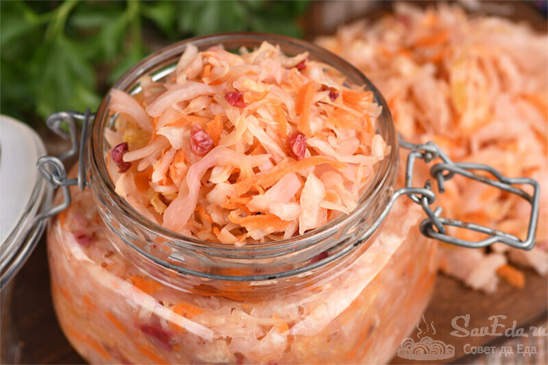 9. Готовую капусту перекладываем в банки, хорошо прижимая, накрываем и храним в холодильнике. За счет добавления брусники капуста получается более кислой, становится ядреной и очень хрустящей. Приобретает розовый цвет. Аромат и вкус бесподобные. Ягоды становятся бледными и почти незаметными в капусте.