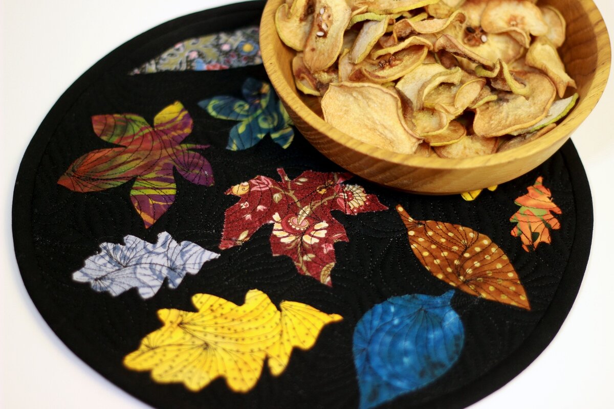Каждая мастерица сделала свой МК. Я решила шить салфетку с осенними листьями из обрезков тканей.