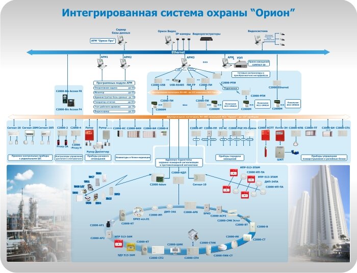Интегрированная система охраны «Орион» представляет собой совокупность аппаратных и программных средств для организации систем охранно-пожарной сигнализации, контроля доступа, видеонаблюдения, автоматического пожаротушения, а также для создания систем контроля и диспетчеризации объектов.