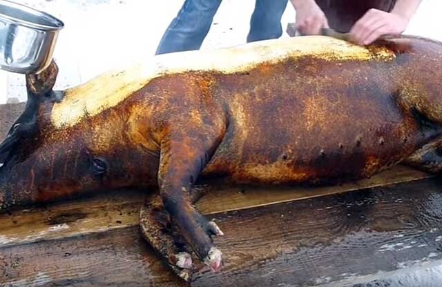Когда щетина снята полностью, обжигают тушу «дочерна». Такие области, как спина и ноги, требуют более длительного воздействия огнем, а вот кожа на животе очень нежная – обработка этих зон должна быть деликатнее.