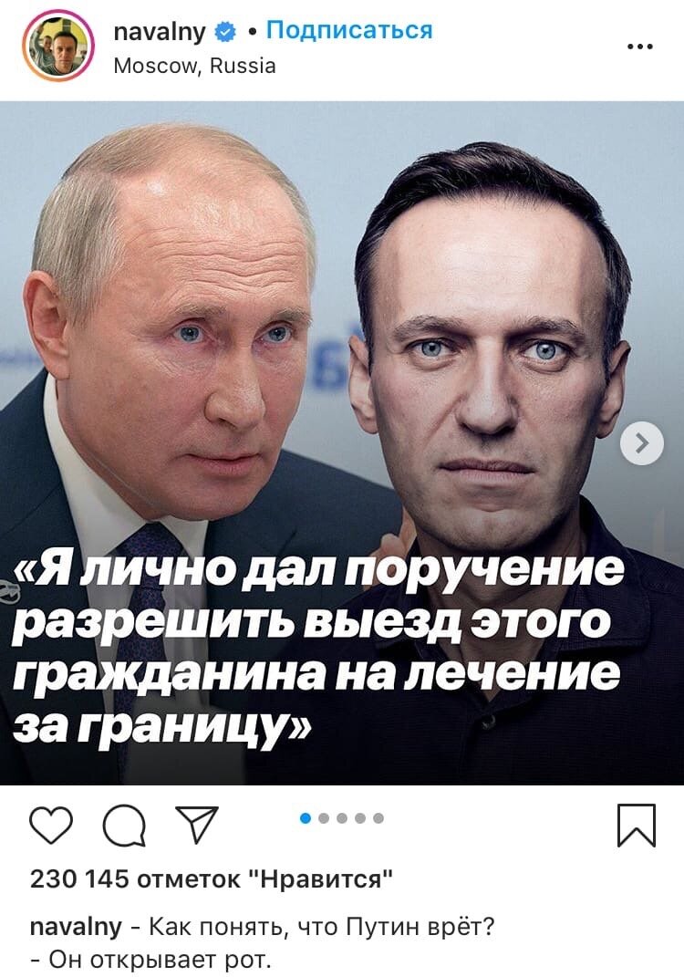 Как понять что Путин врет? Он открывает рот. Именно так оппозиционер написал в своём Инстаграм, когда рассказывал про то, что слова Путина о наличии ограничении на выезд у Навального - ложь.