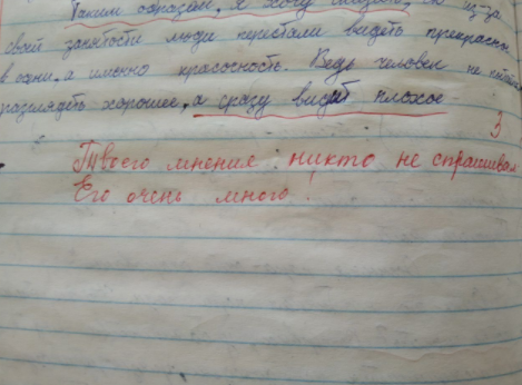Накануне в некоторых СМИ, а также в социальных сетях начала распространяться фотография, на которой запечатлен комментарий учителя, оставленный под сочинением школьника. В комментарии учитель написал: «Твоего [школьника] мнения никто не спрашивал. Его очень много».