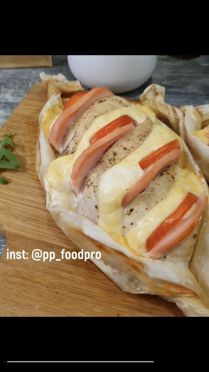 вкладываем в них: сыр, помидор, мясо гот. (у меня куриная ветчина). Так же по желанию можно ещё сверху засыпать тертым сыром.