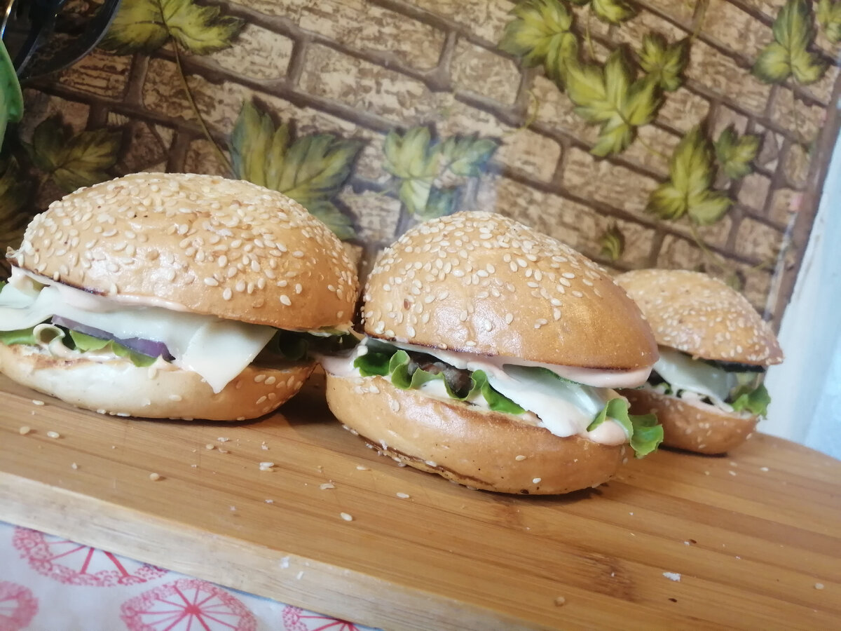 Добрый день, уважаемые читатели. Сегодня я решила приготовить домашние бургеры. Они получаются вкуснее чем, покупаемые в точках перекуса. Давайте для начала приготовим фарш(у меня это говядина со свининой). Для фарша: Фарша получаются многовато, но это не страшно, тк у хозяйки на кухне не бывает ничего лишнего. 😉 Оставляем в сторонку, пусть отдохнёт. Далее приготовим соус: Всё перемешиваем и наш соус готов.🥣 Ну и ингредиенты для самого бургера🍔: Ну что приступаем, непосредственно к приготовлению. Возьмём наши булочки назрежим их пополам вдоль и на сухой сковороде немного подсушим. Возьмём наш фарш и сформируем кругоые котлеты, которые мы придавим и сделаем плоскими, не более 0,5 см. Котлета по диаметру должна быть, чуть больше булочки. Обжариваем их на сухой сковороде или на сковороде-гриль без добавления масла. С двух сторон по минуте, переворачивать несколько раз. Когда вы видите что котлетка готова, на неё ложим квадратик сыра, буквально на 20 секунд, чтобы сыр слегка подплавил