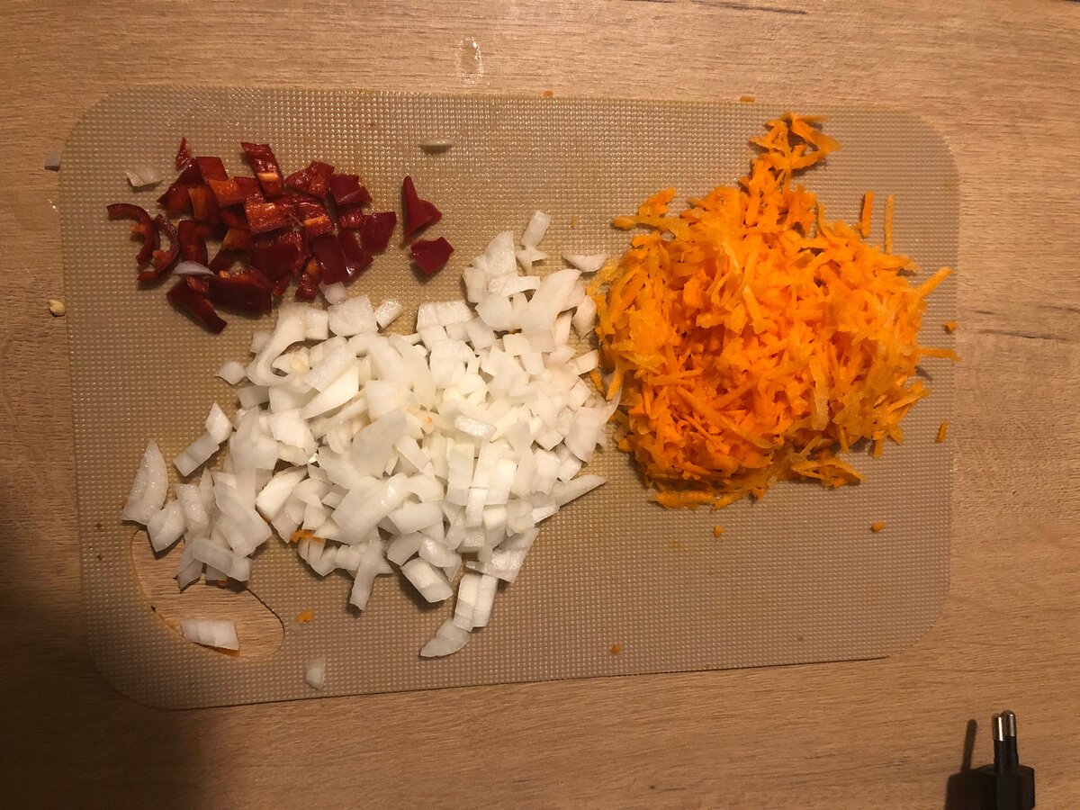 Натираем на терке морковь, перец и лук режем мелкими кусочками.