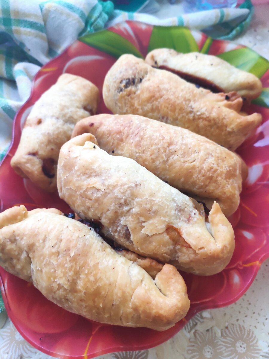 Нежное, хрустящее тесто, внутри сочная начинка - это очень вкусно! Начинку можно использовать любую: капуста жареная, фарш, печень и т.д.