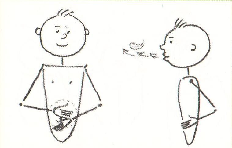 Вдохните через нос. Выдох производится маленькими порциями через сжатые губы. Выдыхая, представьте, что вы пытаетесь удержать на весу над губами пушинку. Данный пункт является подготовительным к упражнению.