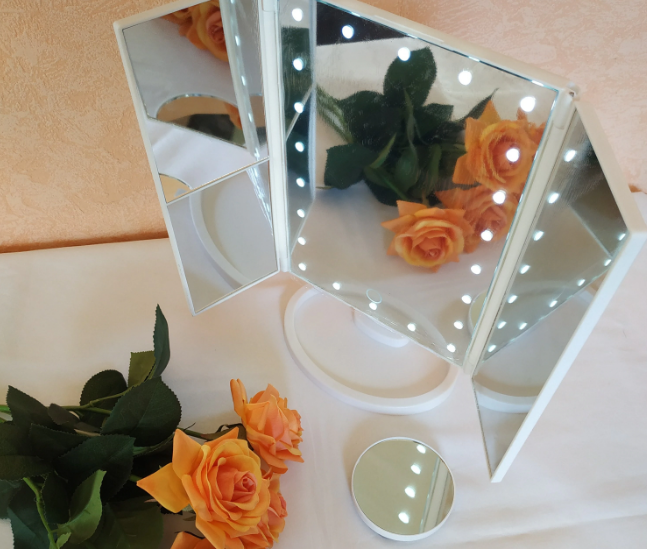 Всего 5 зеркал на одном планшете. В центре основное зеркало без увеличения. Со всех сторон горят лампочки. Внизу сенсорная кнопка вкл\выкл лампочек. От основы идут две створки. На левой створке два зеркала. Верхнее увеличивает в 2 раза. Нижнее в 3 раза. На правой створке одно зеркало, которое увеличивает в 1 раз. И в комплекте идет круглое маленькое зеркальце, которое крепится на присоски и оно увеличивает в 10 раз.