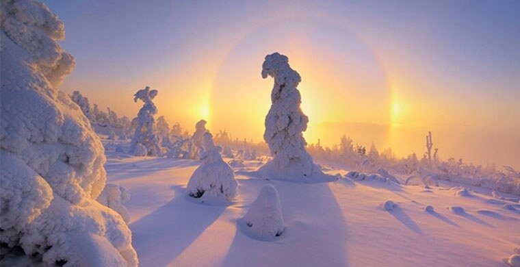 Когда в небе появляется светящееся кольцо вокруг Солнца, Луны или даже фонаря, многие люди думают об НЛО. На самом деле этот оптический феномен называется «гало». Встречается несколько его разновидностей: кольцо, световой столб, тянущийся от восходящего или заходящего солнца, или ложное солнце (паргелий) — появление световых пятен обычно с двух сторон от настоящего солнца. Причина явления — преломление света в кристаллах льда, содержащихся в атмосфере.