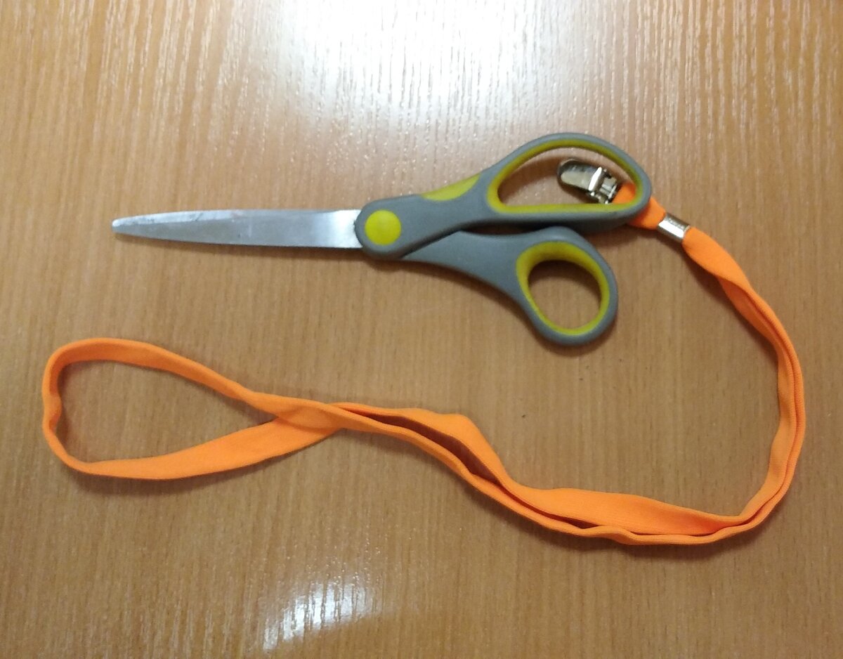 1. Ножницы. Не терять ножницы и не заниматься их поисками поможет простой шнурок для бейджей или мобильного телефона. Можно не извращаться и взять обычную ленточку, или даже тонкую веревочку.