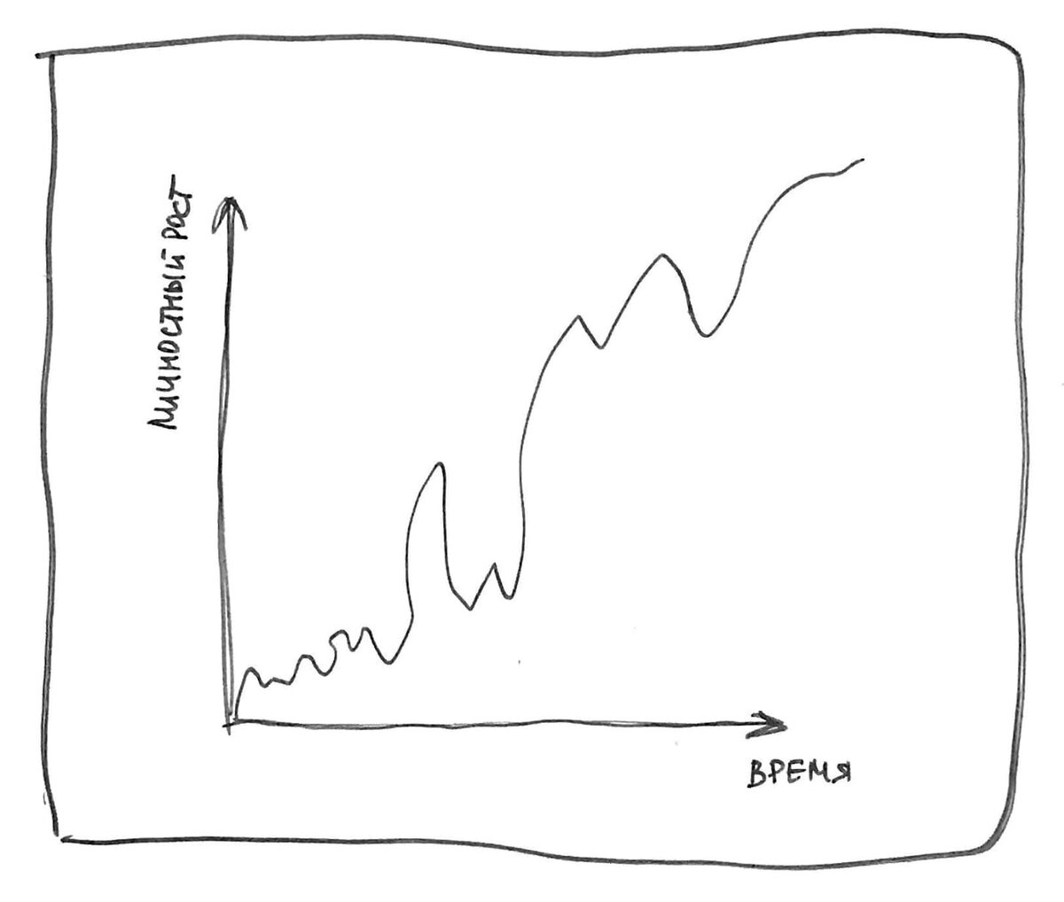 Так вот, как нам известно, личностный рост происходит не планомерно, а с небольшими перебоями. На это может повлиять куча внешних и внутренних факторов, от простейшей пасмурной погоды и/или недосыпа, до отсутствия финансов и/или энергии для осуществления желаемого. При этом довольно парадоксальным кажется факт, что мы развиваемся каждую секунду нашего бытия, даже просто смотря на точку на стене наш мозг учится – обрабатывает информацию касательно самой стены, затем обстановки в комнате, нашего физического состояния и психологического. Даже прокрастинируя внешне мы можем прогрессировать внутренне.