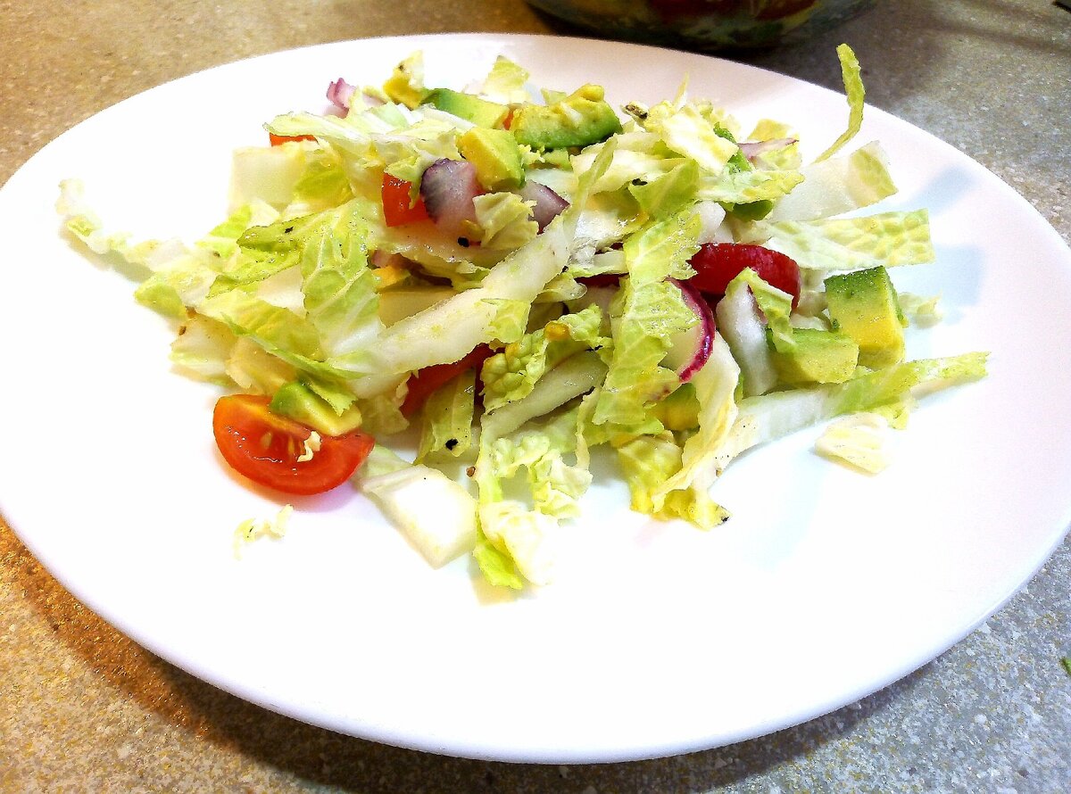 Это салат с авокадо. Салат получается витаминный, насыщенный и очень полезный. А главное - без вреда для фигуры!