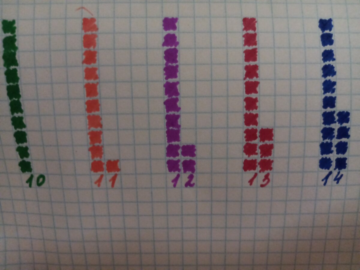Важно не перемешивать сразу все примеры, которые подходят к диапазону 0-20. Самое сложное для деток - это переход через десяток. Поэтому его не трогаем, закладываем для него прочную базу. Всё выполняем с наглядностями: счетными палочками, закрашенными квадратиками, магнитами, кружочками из счётного пенала и т.п.