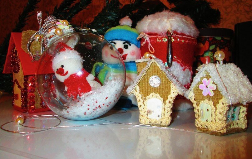 Я далеко не первый год занимаюсь тем, что готовлю своим приятелям и сотрудникам подобные презенты к зимним праздникам. Украшают такие домики и наше новогоднее деревце. А вариантов создания их - огромное множество. Я же всегда импровизирую, и мои игрушки не повторяются.