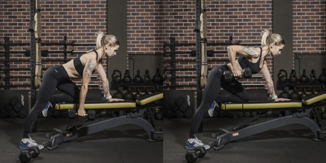Упритесь в лавку левыми ладонью и коленом, правую ногу выпрямите, стопу прижмите к полу, руку с гантелью вытяните вниз. Подтяните вес к поясу и опустите обратно. Не поднимайте плечо, не горбите спину. Не меняйте положение корпуса на протяжении всего упражнения. Взгляд направьте в пол перед собой, чтобы шея находилась на одной линии со спиной.