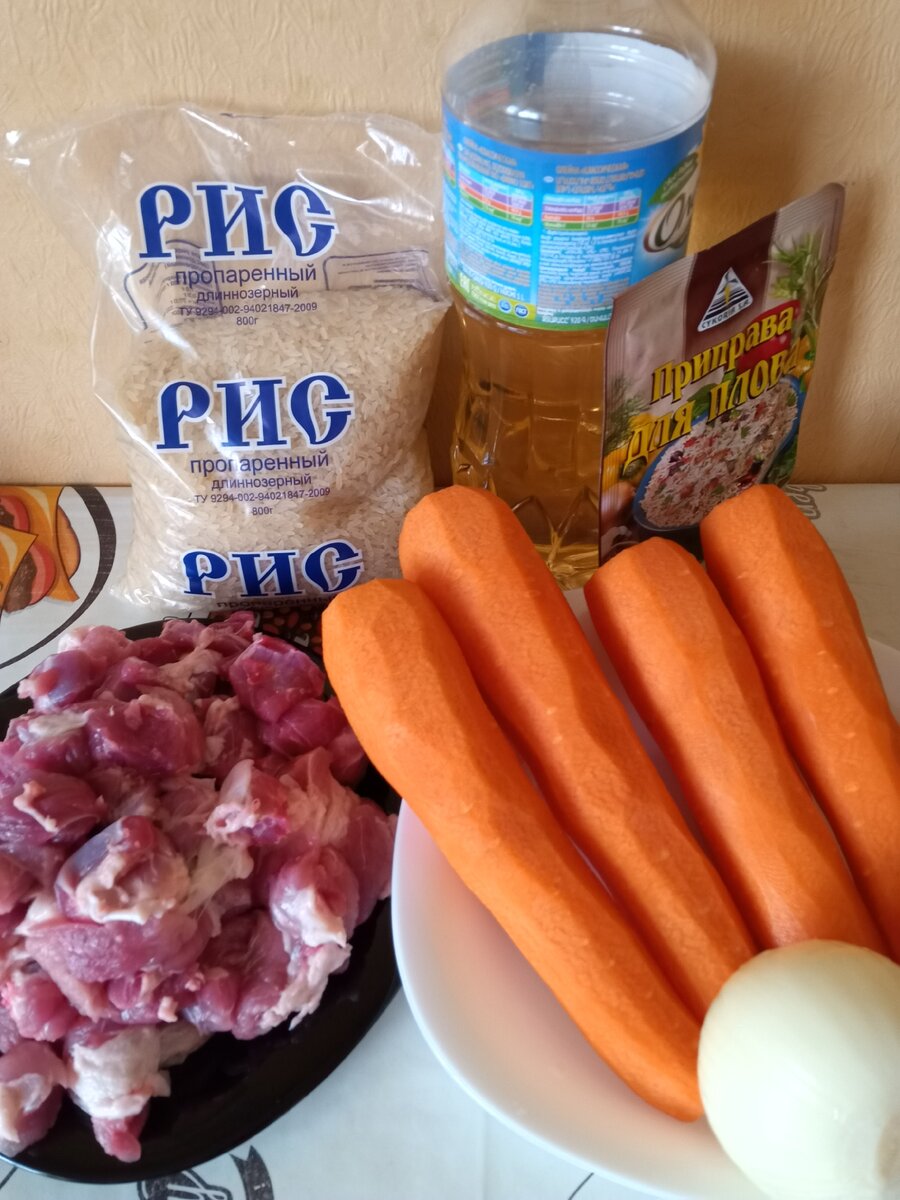 Мясо режем на кусочки, обжариваем до золотистого цвета. Морковь режем соломкой, лук полукольцами выкладываем в казан, обжариваем до полуготовности. Добавляем специи и солим.