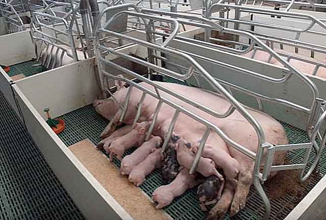 Допускается размещение рядом станков с другими самками. Свиноводство на большой ферме предполагает установку в ряд до десятка отделений для опороса.