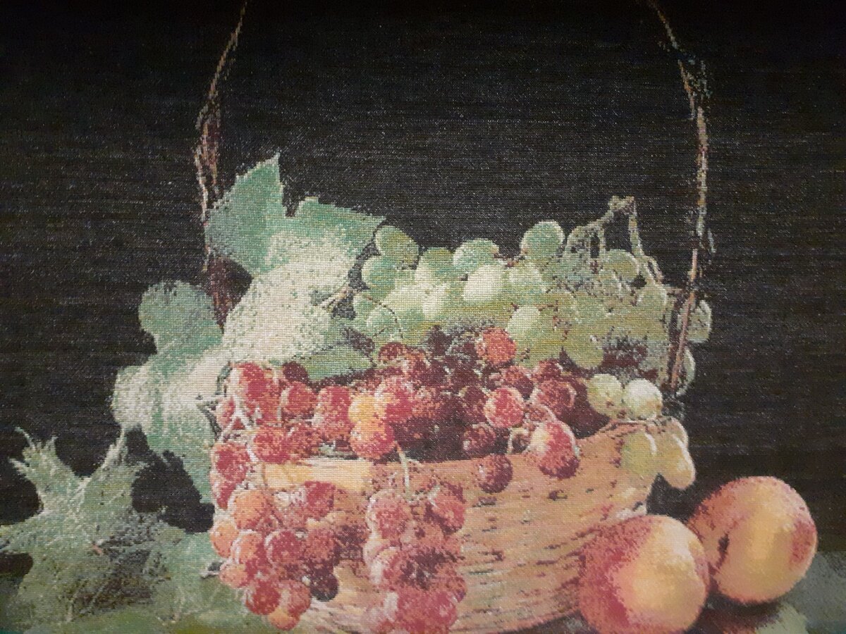 Первой работой оттуда стала Корзина фруктов. Размер 440*395 (!!!) крестиков. Половина - это черный фон. Шила ее я ровно 6 месяцев. Громадная получилась - 69*63 см