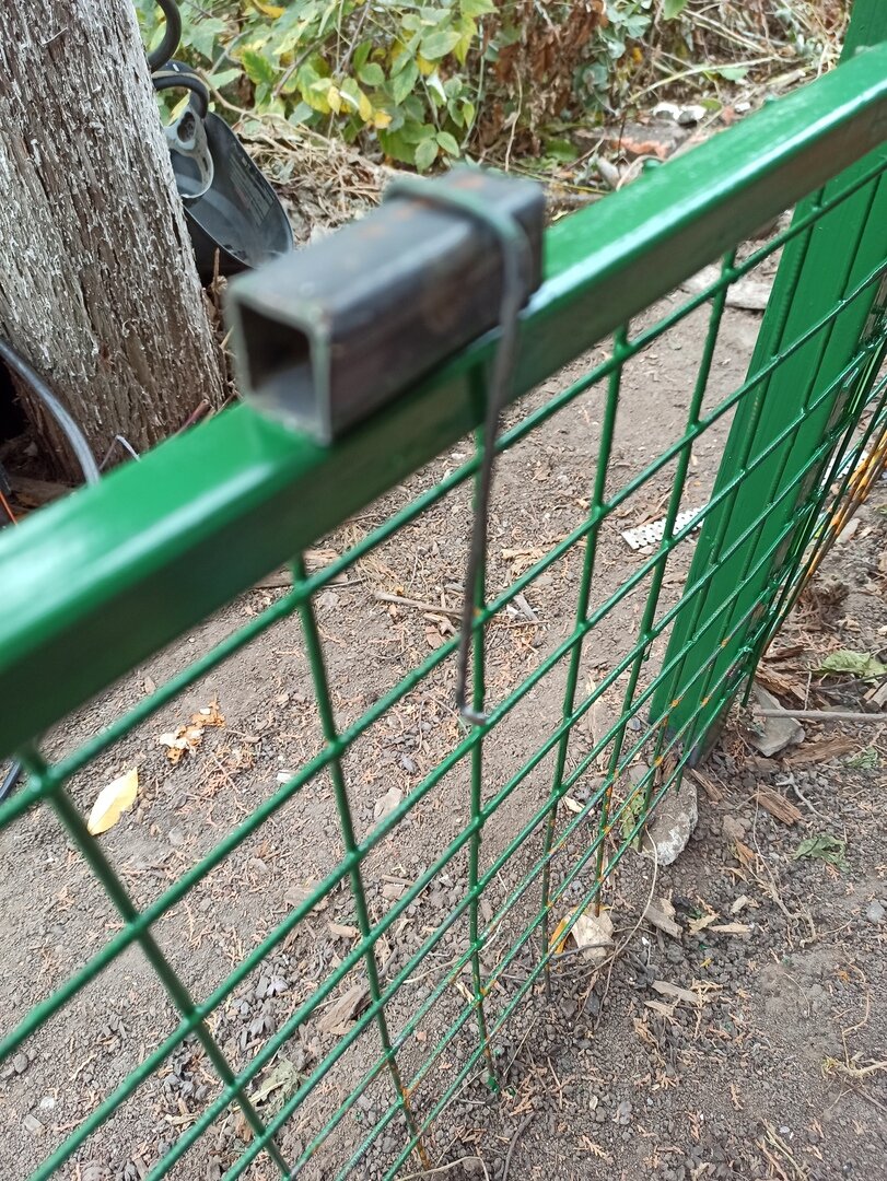 Сначала он вынул из кармана и показал мне крючки, сделанные из двух электродов, и пару маленьких кусков профильной трубы 20 на 20, а потом надел их на лаги забора ( параллельные перемычки), как на фото