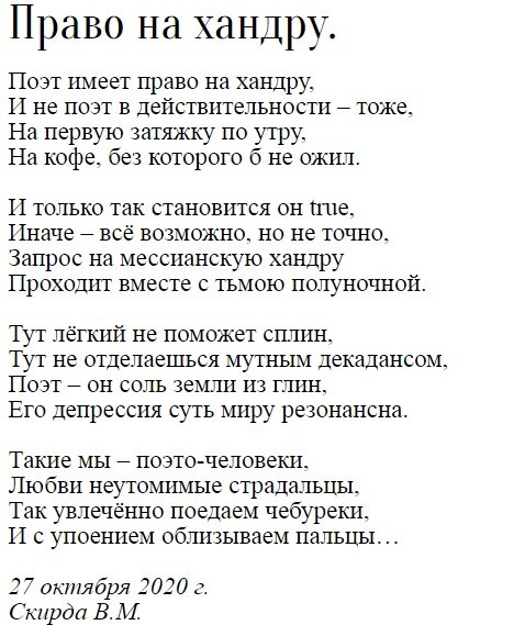 Поэт имеет право на хандру, И не поэт в действительности – тоже, На первую затяжку по утру, На кофе, без которого б не ожил. И только так становится он true, Иначе – всё возможно, но не точно, Запрос на мессианскую хандру Проходит вместе с тьмою полуночной. Тут лёгкий не поможет сплин, Тут не отделаешься мутным декадансом, Поэт – он соль земли из глин, Его депрессия суть миру резонансна. Такие мы – поэто-человеки, Любви неутомимые страдальцы, Так увлечённо поедаем чебуреки, И с упоением облизываем пальцы… 27 октября 2020 г. Скирда В.М.