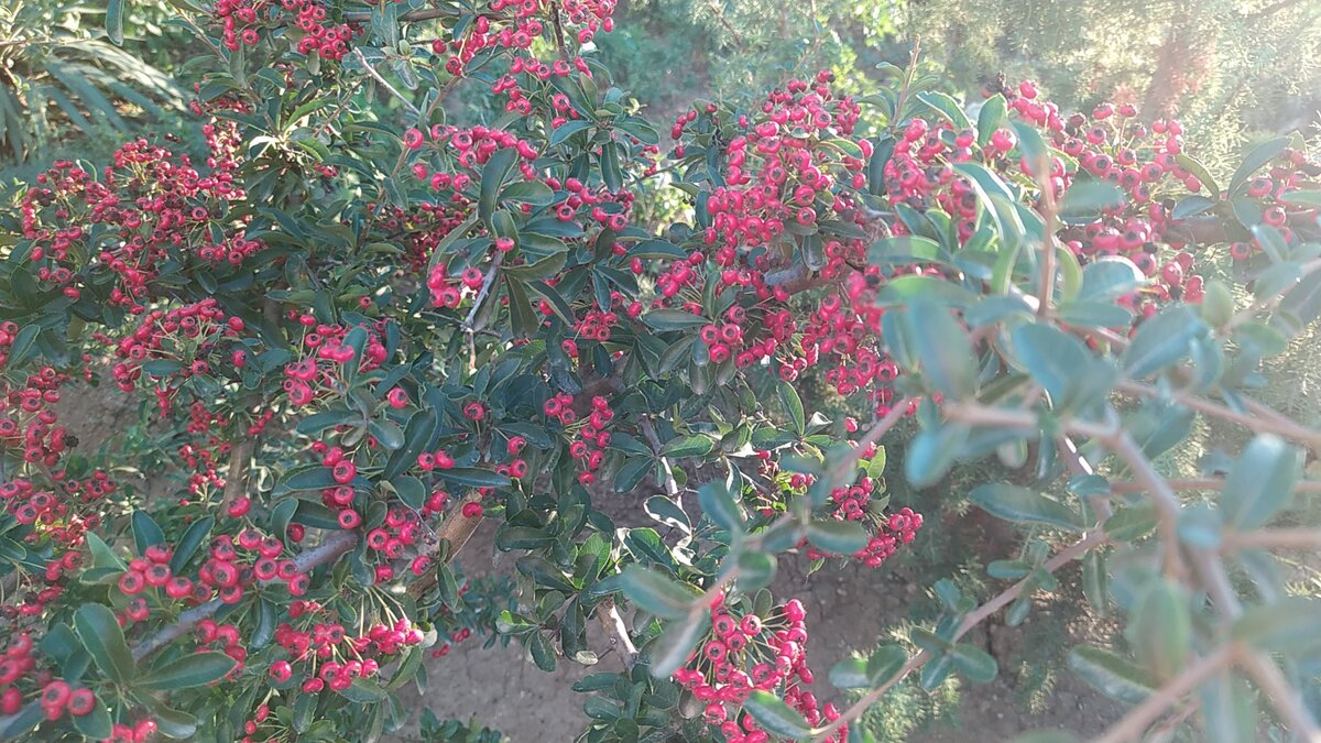 Пираканта ярко - красная - относится к виду цветковых растений рода Пираканта семейства Розовые . Этот вечнозелёный колючий кустарник широко используется как декоративное растение , применяется в ландшафтном дизайне в качестве живой изгороди .