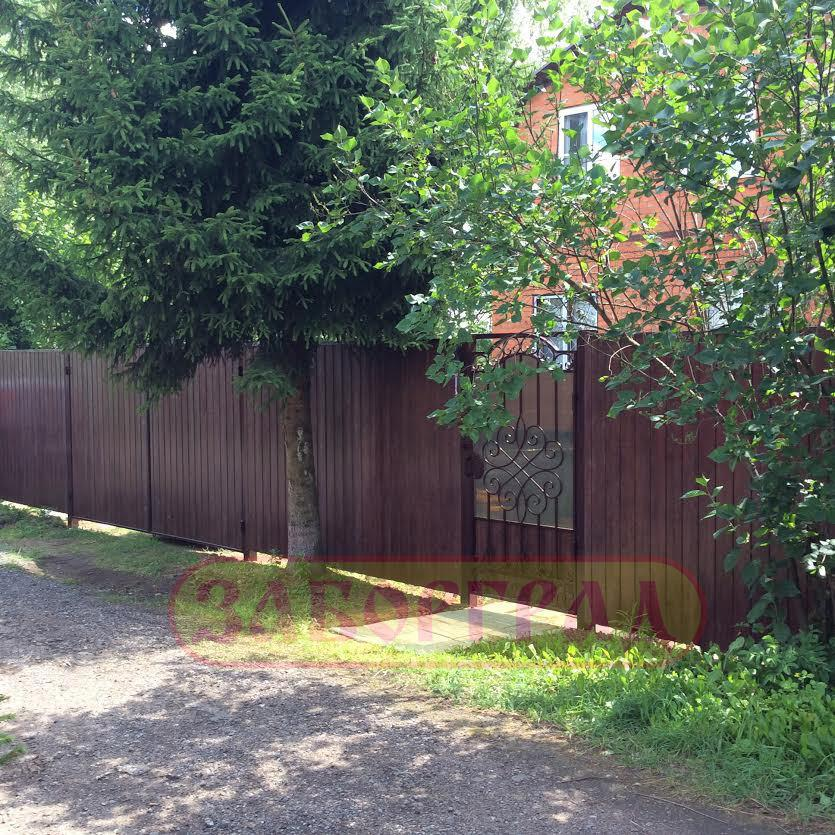 - Для красоты и долговечности выбирайте профлист под дерево с двусторонним цветным покрытием. Так эстетика будет не только снаружи, но и в границах участка. Для окраса под дерево оптимально будет выбрать профлист с вертикальным рельефом, имитирующий деревянный штакетник. Оптимальный союз для такого профлиста – опоры из кирпича или каменной кладки. Это будет выглядеть очень респектабельно, но при этом за покрытием не нужно будет ухаживать, как за настоящим деревом.