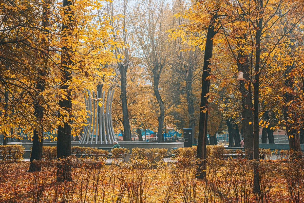 🍁 Одно из них — центральная аллея, расположенная на основной территории. Здесь находится фонтан и, даже несмотря на то, что сейчас он не работает, его металлическая конструкция, напоминающая всплеск воды, украсит любое фото.