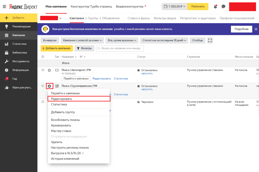 Для этого следует в интерфейсе Директа на уровне «Кампании» кликнуть на «Шестеренка»-«Редактировать».
