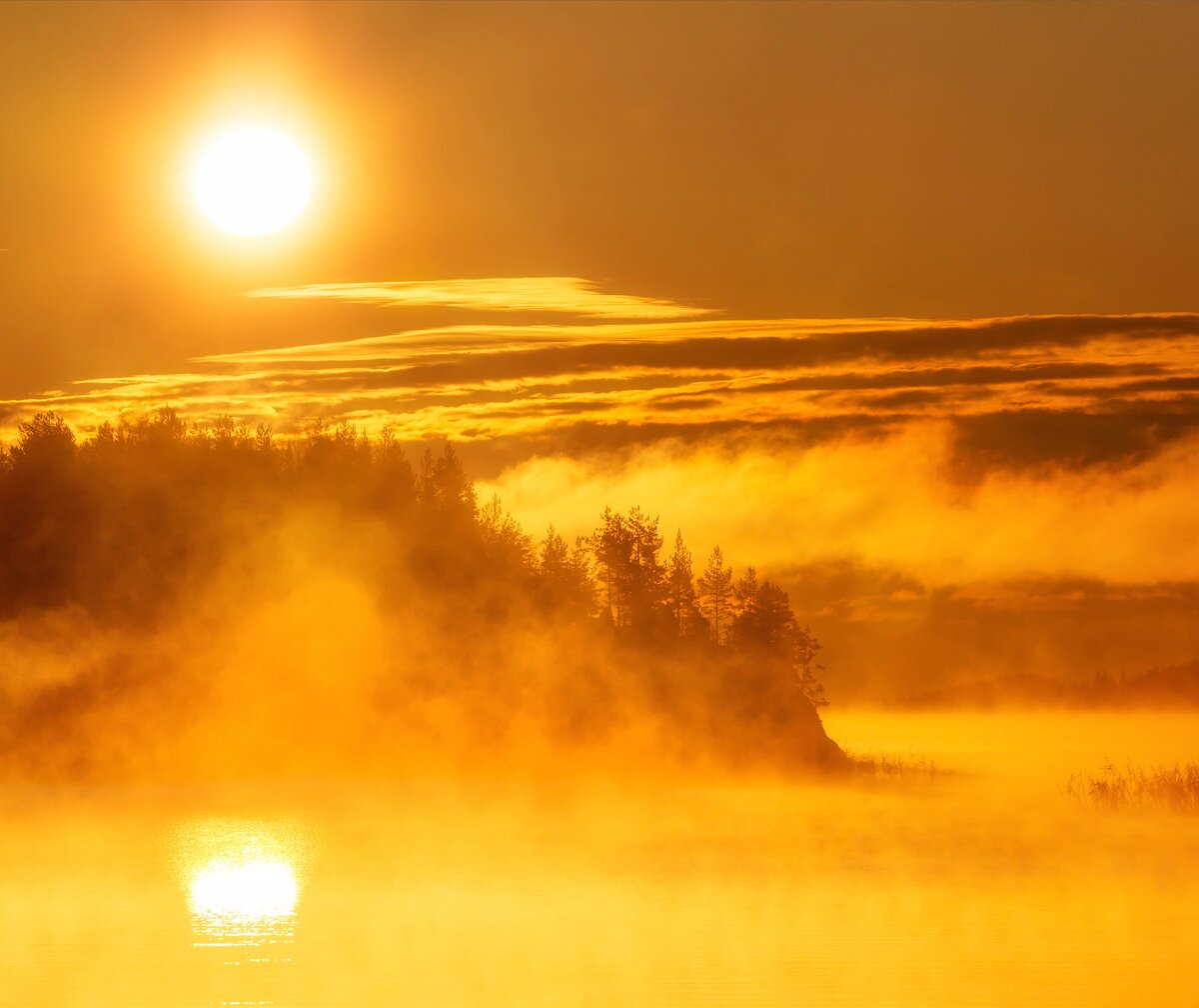 А это Ладожское озеро, над которым оранжевым шаром взошло солнце, залив водную гладь золотым светом.