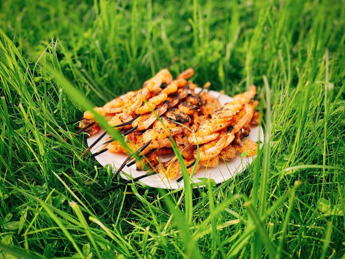 Раскочегарьте свой гриль или мангал до разумного жара, нанизайте на шпажки креветки и жарьте где-то по 2-3 минуты на сторону.