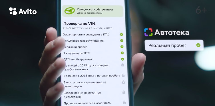 Итак, мы смотрим рекламу сервиса «Автотека» от Авито, где люди перед покупкой в один клик проверяют историю машин — количество владельцев, состояние (битый/не битый), пробег и другие важные характеристики. Интересно, что в этой рекламе показаны обычные машины, даже номера не скрыты.