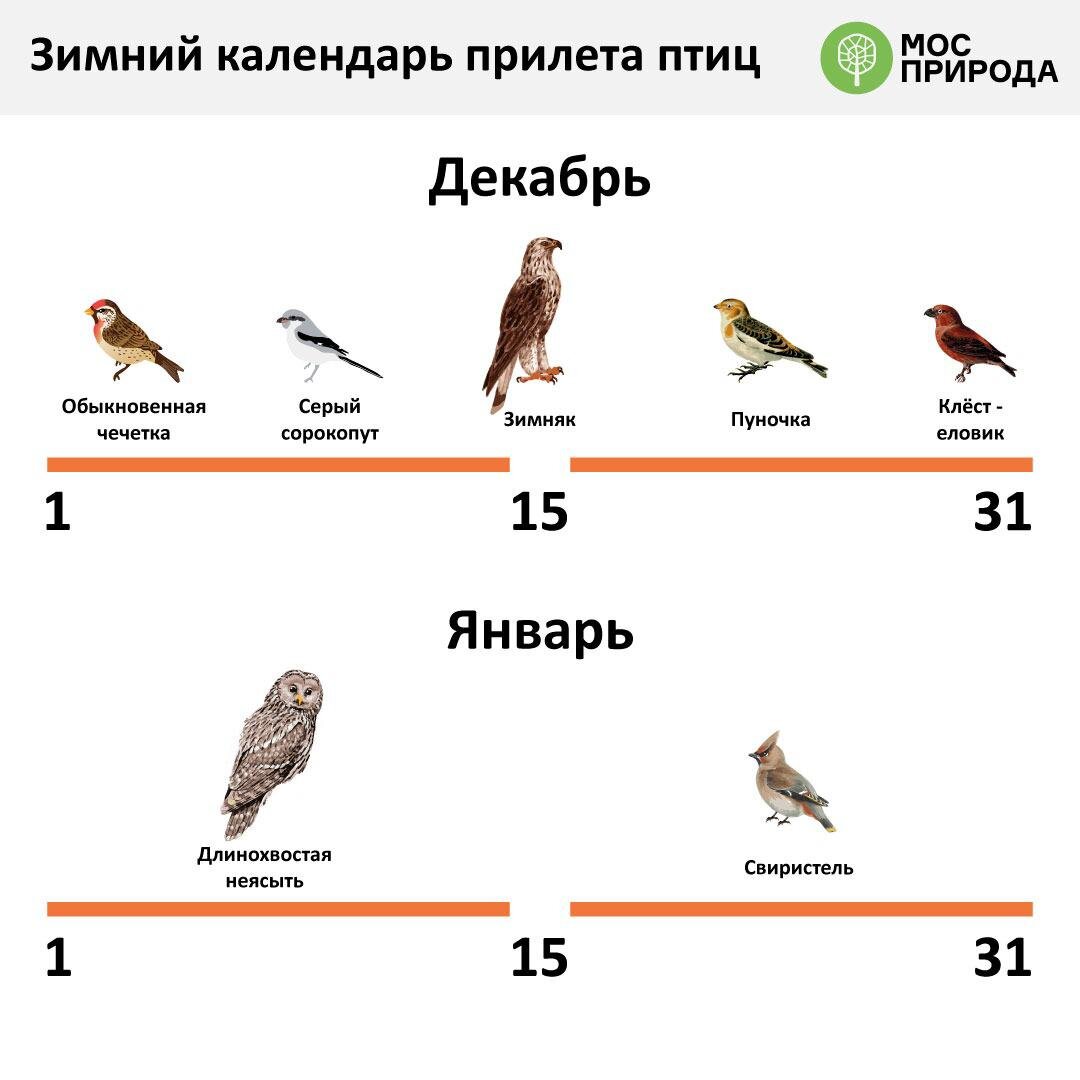 Осенью многие птицы отправляются в путь в тёплые страны, где проведут всю зиму. А на их место в Москву прилетают пернатые друзья из Северных широт. Первыми прилетают обыкновенная чечётка и серый сорокопут, им в хвост дышат зимняк, пуночка и клёст-еловик. Эти виды птиц можно увидеть на природных территориях Москвы в декабре.