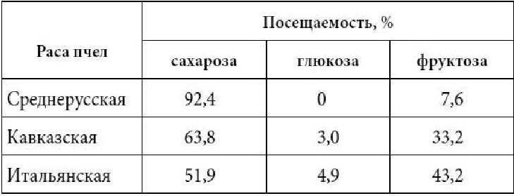 Считается, что по степени привлекательности для пчел сахара можно расположить так: сахароза, глюкоза, фруктоза. Для изучения этого вопроса О.Зауралов (1985) провел опыт, который показал, что пчелы популярных рас чаще всего посещали чашки с сахарозой.