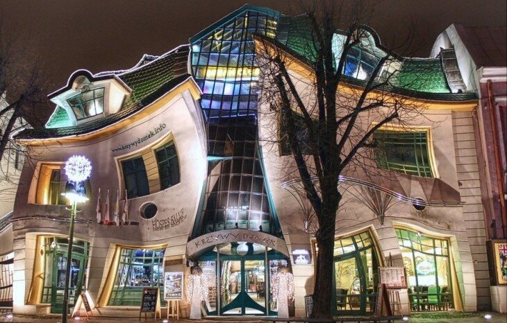 Несмотря на причудливый внешний вид, «кривой дом» невероятно функционален внутри и по праву считается одной из главных достопримечательностей города. Возле этого поистине необыкновенного дома постоянно кипит жизнь и движение. На первом этаже причудливого дома располагаются уютное кафе и магазинчики. А на втором этаже находятся студии популярных радиоэфиров. Будете в Польше — обязательно сфотографируйтесь на фоне этого футуристического строения.