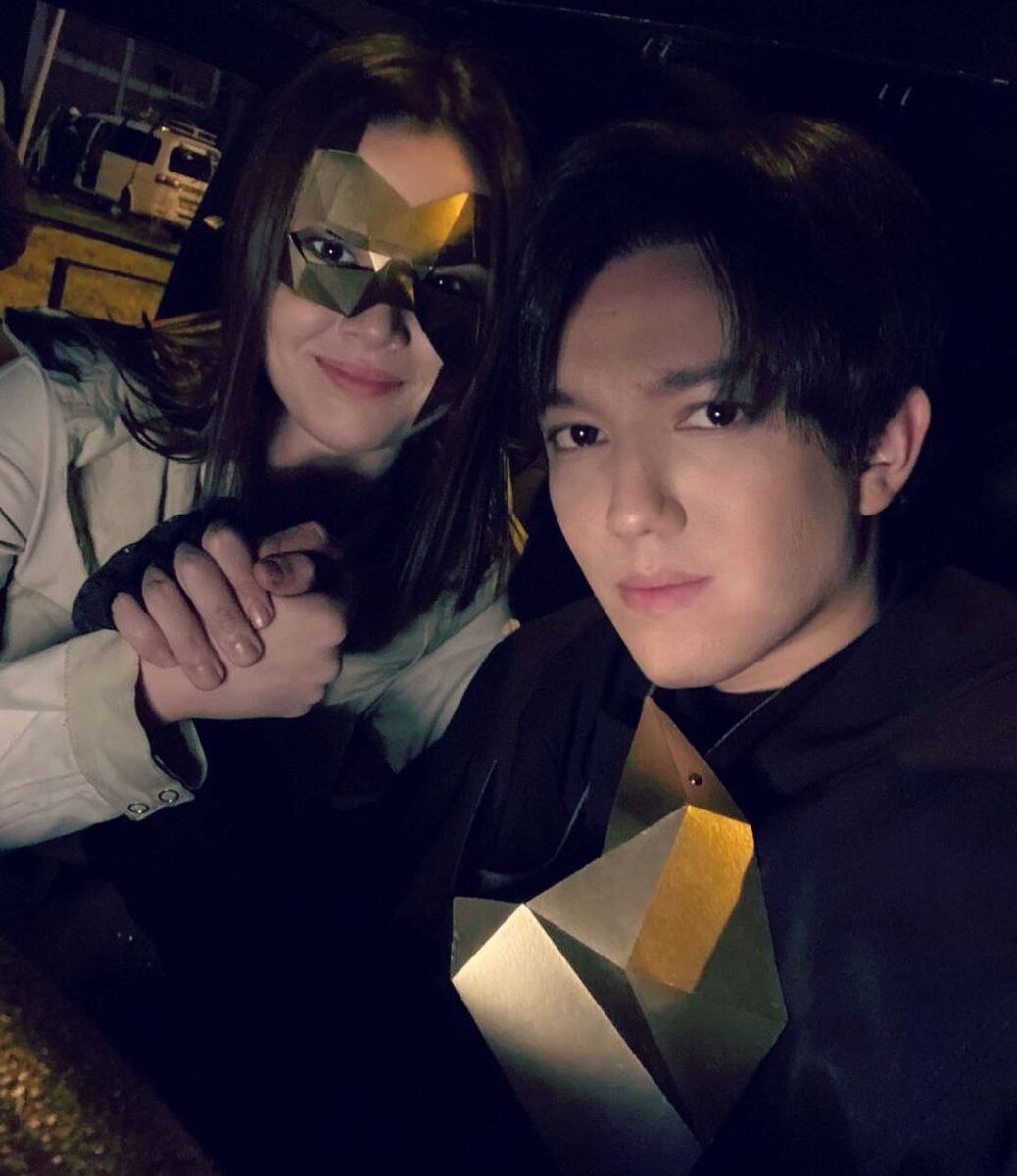 И добавил фотографию, сделанную в автомобиле с прекрасной незнакомкой в блестящей маске. У Димаша какой-то предмет такого же цвета, возможно, это такая же маска, только в другом исполнении. Обратите внимание, артист во время селфи держит девушку за руку. Конечно, это особый знак внимания к даме. Заметьте, что артист редко кого держит за руку на совместных фото, ну разве что детишек, которых и поднимает, и целует по старинному обычаю.