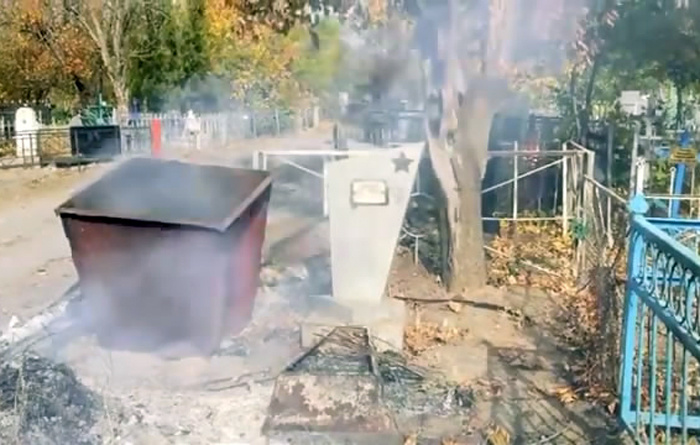 Как оказалось, могила загорелась в результате перекинувшегося на нее огня с пылающего мусорного бака, расположенного в непосредственной близости. В итоге частично повреждено лакокрасочное покрытие металлического памятника.