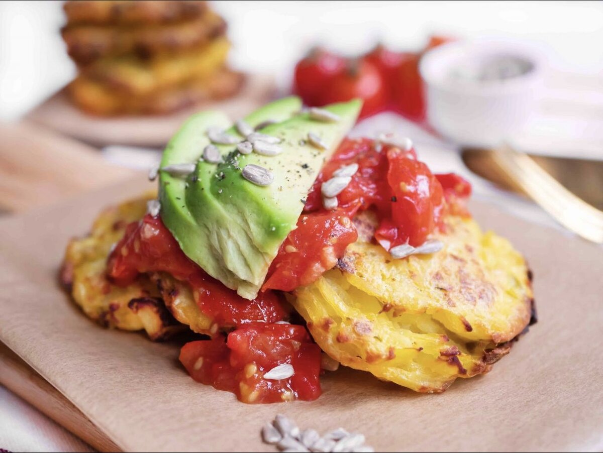 11. Украсьте готовые драники помидорами, авокадо, приправьте солью и перцем и подавайте.