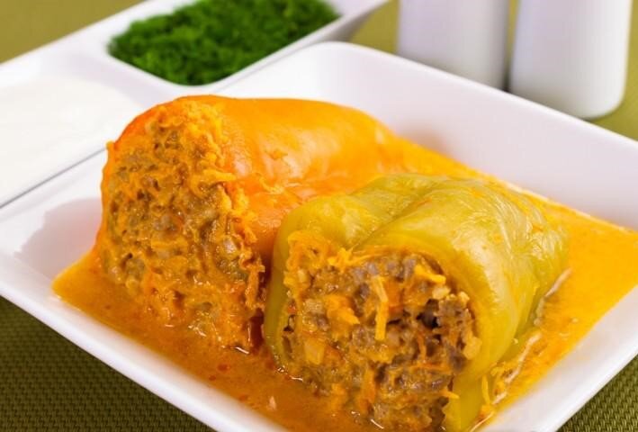 Подавать со сметаной или с соусом, в котором тушились перцы.