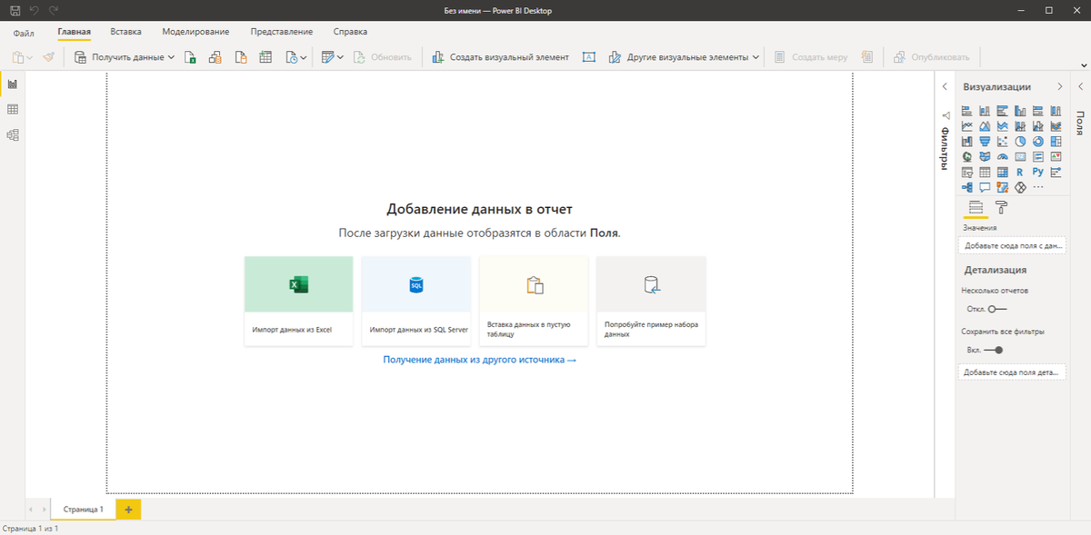 Иконка «Попробуйте пример набора данных» позволяет загрузить в Power BI пример данных для последующего изучения работы Power BI. Предлагаемый набор данных мы использовали для построения визуализации, которую вы увидите на скриншотах ниже.