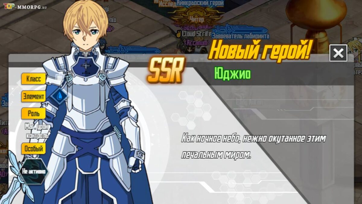 Юджио в Мастера Меча Онлайн 2 получил ранг SSR, выполняет защитную роль и использует стихию воды.