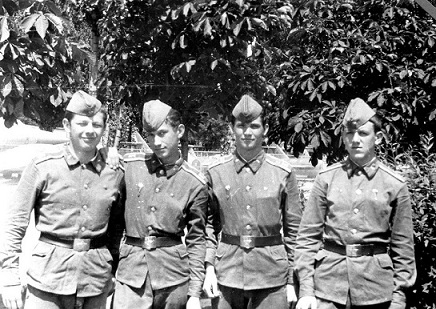 * - на фото: - СВВАУЛШ - 05.07.74г. У казармы. Ю.Валезнев, М.Лаврин, И.Ткаченко, В.Пономаренко.