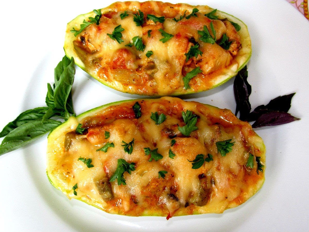 Вырезаем внутренности у кабачков. Чеснок выдавливаем через чеснокодавку и лук мелко режем. Морковь трем на терку, шампиньоны режем кубиками. Помидоры и перец режем так же. Морковь, лук, чеснок и грибы обжариваем на подсолнечном масле. Перемешиваем с остальными овощами. Наполняем кабачки начинкой. Присыпаем сыром и зеленью. Ставим в духовку и ждем когда кабачок станет мягким.